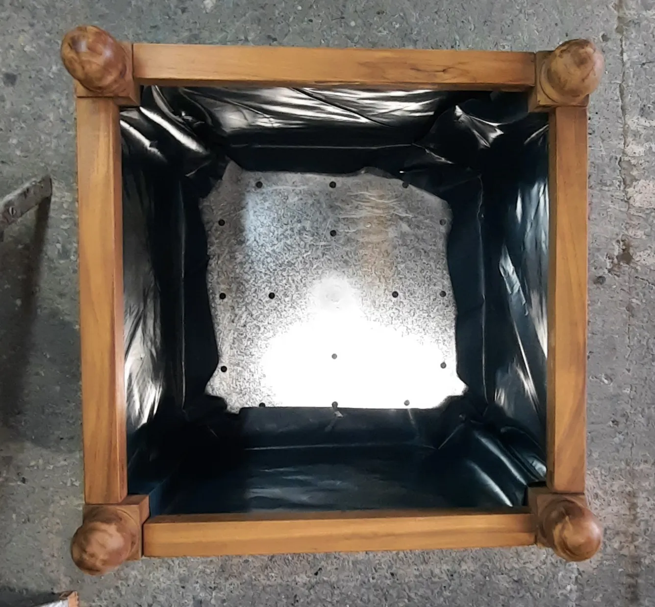 L’intérieur des bacs est protégé par une couche de goudron dilué et à fin que la terre ne soit pas en contact avec le bois, une feuille de polyane. Une feuille de géotextile est placée au fond du bac. Nous conseillons de placer à l’intérieur du bac une couche de 4 à 7 cm de billes d’argile à fin de faciliter le drainage. Vous pouvez ensuite ajouter la terre appropriée à votre plante.
